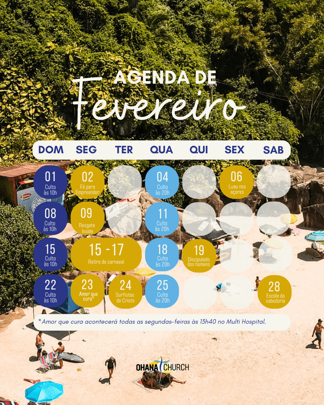A Ohana em parceria com os Surfistas de Cristo Floripa realiza uma vez no mês um encontro na praia do Matadeiro para celebrar a comunhão, aprender a arte do surf e louvar ao senhor. Acompanhe o nosso calendário e venha participar do próximo Surfday conosco!